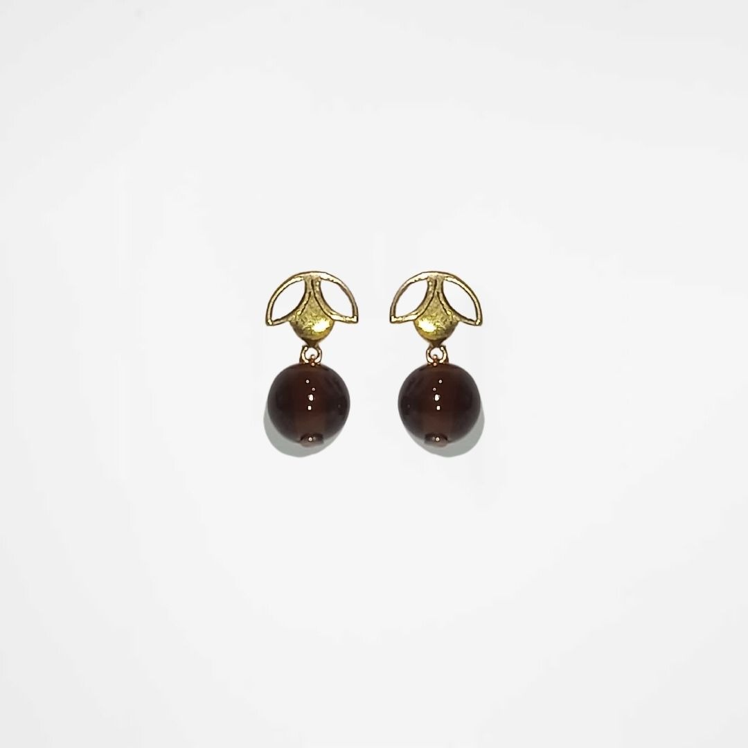ブラウンのラウンドビーズにイエローゴールドのアクセントを効かせたイヤリング。
